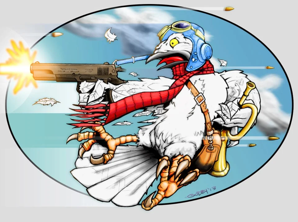 Yankee Doodle Pigeon was a piece designed as half of a bigger image. Eddie Nunez, of DC Comics drew an image featuring Dick Dastardly flying his plane and Muttley on the front gun. I drew Yankee Doodle Pigeon firing back to honor Eddie’s work as a fantastic artist. I enjoyed working on this image. I penciled it by hand, then inked it, and scanned it for finalization. It was colored digitally in Photoshop. Blur effects were added to the bullets. The character is a stylized version of the original famed 80s Saturday-Morning Cartoon character. Total time spent on this illustration was approximately 6 hours. It was a lot of fun!